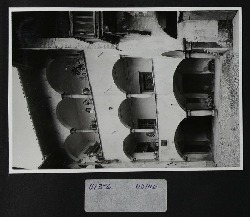 Udine: abitazione che si sviluppa su tre piani con colonne che sostengono grandi arcate in muratura. Il porticato è abbellito da vasi con fiori. Al secondo piano, una donna e una fanciulla. La tipologia ricalca quella del portico-loggia nelle residenze venete pre-palladiane.