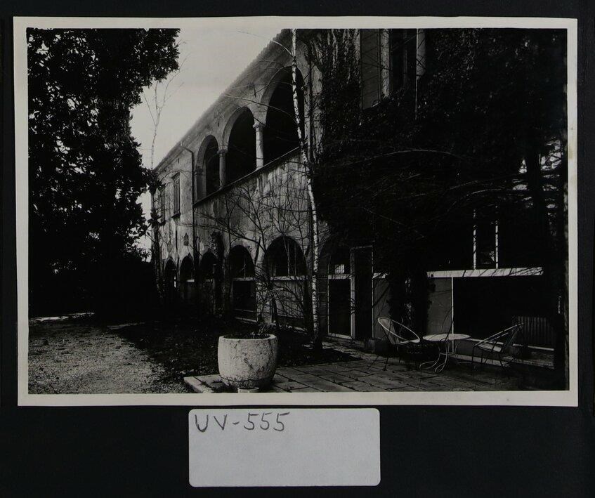 Udine: abitazione che si sviluppa su due piani con colonne che sostengono arcate a tutto sesto in muratura. La tipologia ricalca quella del portico-loggia nelle residenze venete pre-palladiane. A destra, un tavolino e due sedie.