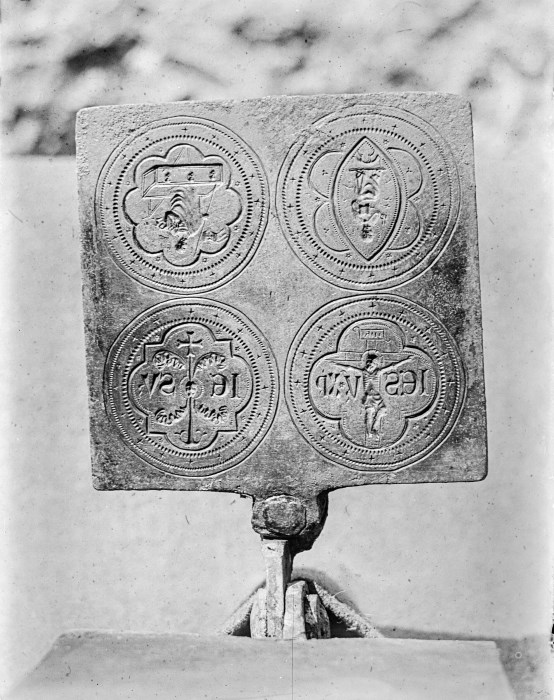 Riproduzione fotografica di un antico stampo in ferro battuto per la produzione di ostie.