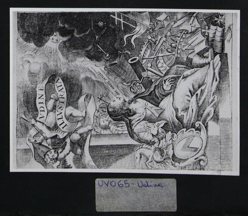 Riproduzione dell'antiporta tratta dal libro "Udine illustrata" di Giuseppe Capodagli (ristampa anastatica, 1665). In alto a sinistra, due putti che suonano la tromba tra il cartiglio che riporta il titolo dell'opera. In primo piano, l'allegoria della città di Udine, seduta accanto allo stemma di Udine e a un cavallo rampante di piccole dimensioni alla sua destra, che rivolge lo sguardo al sole tra le nubi. In basso a destra sono disposti vari oggetti e simboli come il compasso, una tavolozza con i pennelli, una corona di spine, alloro, una croce di Malta, una croce patente, una piccola spada e un pastorale.