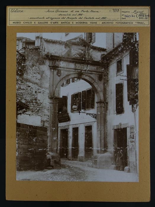 Udine: porta Nuova (arco Grimani), in pietra piasentina, con arco a tutto sesto rinascimentale e il Leone di San Marco. Si vede anche l'insegna di un negozio di proprietà di Achille Bianchi.