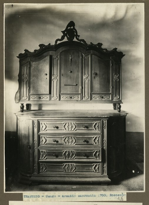 Riproduzione fotografica di un armadio con cassettiera in legno conservato nella sacrestia presso la Chiesa di San Tommaso Apostolo a Usago di Travesio.
