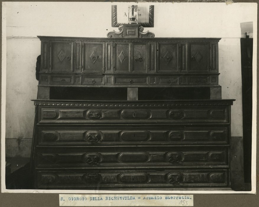 Riproduzione fotografica di un armadio in legno con cassettoni, nella parte inferiore e portelle nella parte superiore conservato nella sacrestia della Chiesa di San Giorgio Martire a S. Giorgio della Richinvelda.