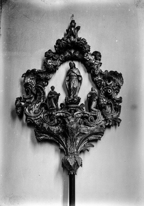 Riproduzione fotografica di un arredo processionale con una "Madonna fra i Santi".
