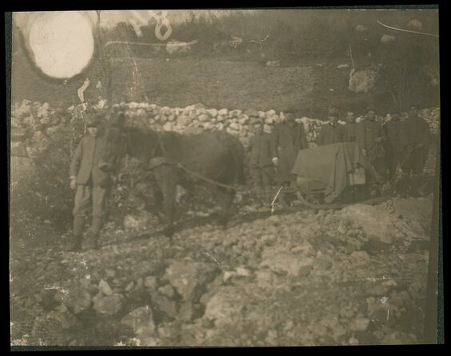 Gruppo di soldati addetti al recupero delle salme dei caduti della Prima Guerra mondiale, ritratti con il carro trainato da mulo usato per le onoranze, davanti ad un muro di recinzione in pietra