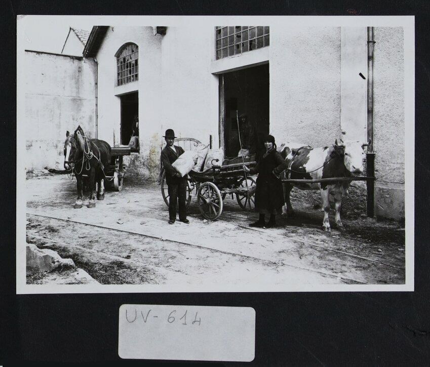 Udine, viale Palmanova: a destra e a sinistra, una mucca e un cavallo che trainano un carro per il trasporto delle merci; al centro, un uomo e una donna. Lo scatto è stato realizzato presso i magazzini della ditta Muzzati & Magistris, che ha fondato i mulini sul fiume Ledra (1901). I magazzini sono stati demoliti agli inizi degli anni Novanta.