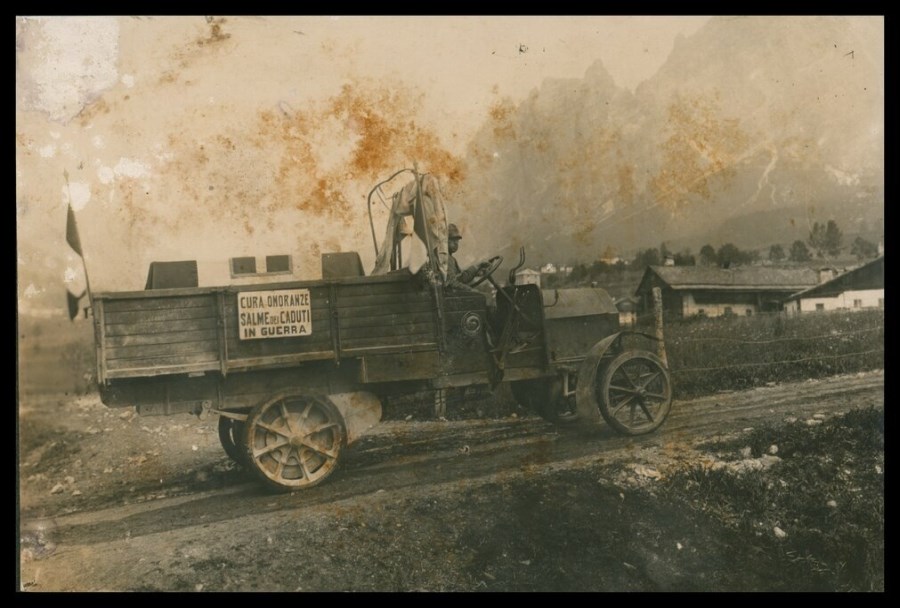 Automezzo per le onoranze alle salme dei caduti durante la Prima Guerra mondiale, con militare alla guida