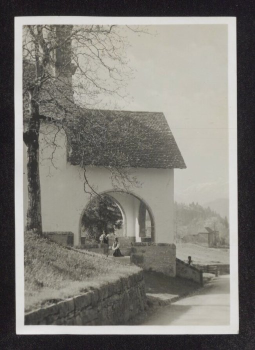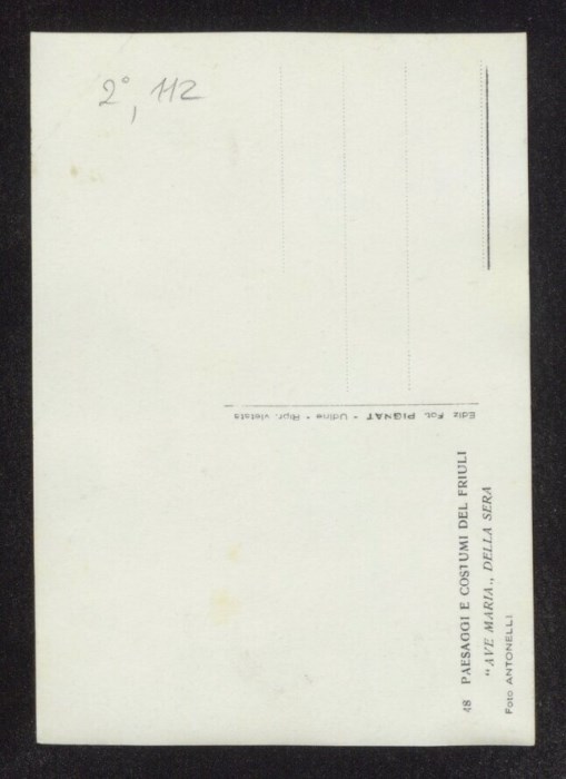 Lo scatto di Umberto Antonelli, farmacista e fotografo attivo in Carnia tra 1909 e 1949, è parte della serie di cartoline pubblicate dal fotografo editore Carlo Pignat con il titolo "Paesaggi e Costumi del Friuli" nella seconda metà degli anni Trenta del Novecento, raffiguranti tutte una Carnia e un Friuli arcadici. La chiesa ritratta è quella della Madonna del Carmine a Liariis, frazione di Ovaro.