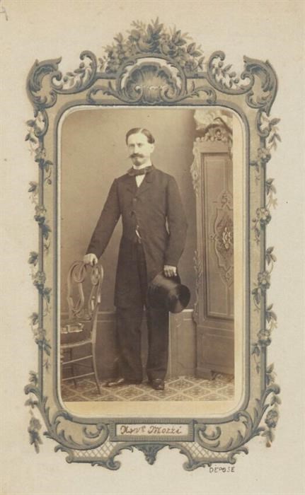 Ritratto in studio dell'Avvocato Mozzi con un cappello a cilindro in mano