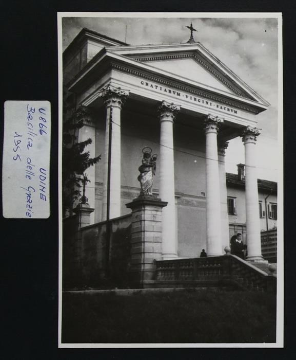 Udine, piazza I Maggio: veduta del santuario della Beata Vergine delle Grazie. Il pronao (1838-1841, 1850-1851), con timpano e quattro colonne (in pietra bianca di Brioni), è stato progettato dall'architetto Valentino Presani. A sinistra, si noti la scultura con la Madonna e il Bambino.