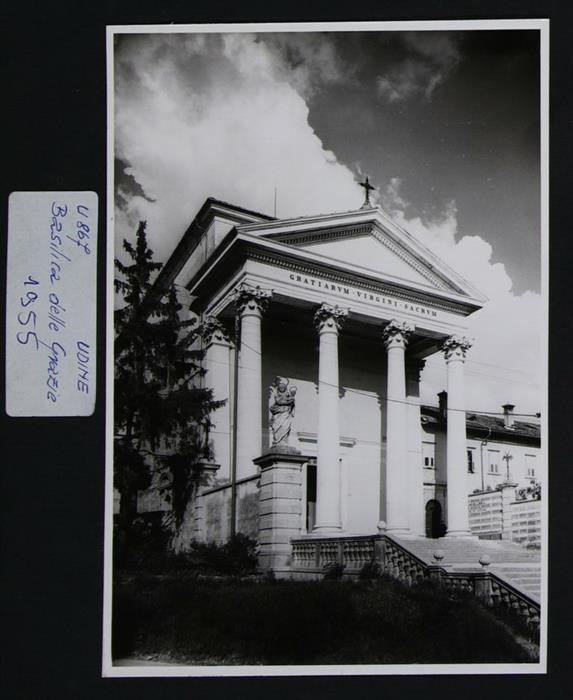 Udine, piazza I Maggio: veduta del santuario della Beata Vergine delle Grazie. Il pronao (1838-1841, 1850-1851), con timpano e quattro colonne (in pietra bianca di Brioni), è stato progettato dall'architetto Valentino Presani. A sinistra, si noti la scultura con la Madonna e il Bambino.