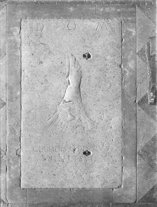 Riproduzione fotografica di un bassorilievo in pietra di uno stemma con un'iscrizione.