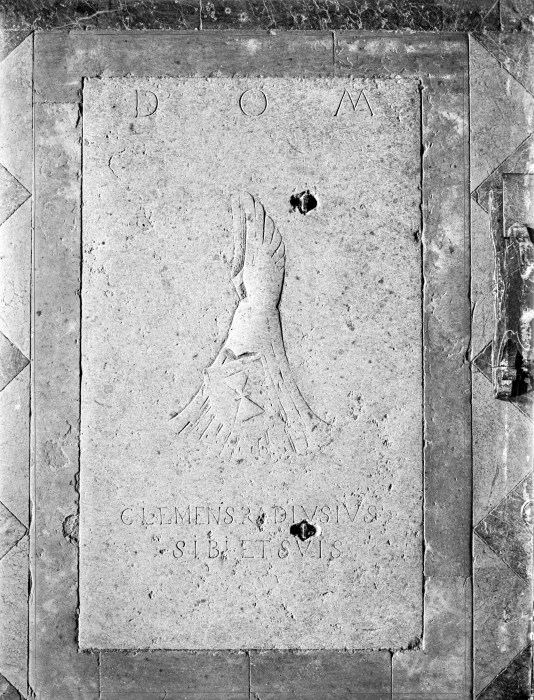 Riproduzione fotografica di un bassorilievo in pietra di uno stemma con un'iscrizione.