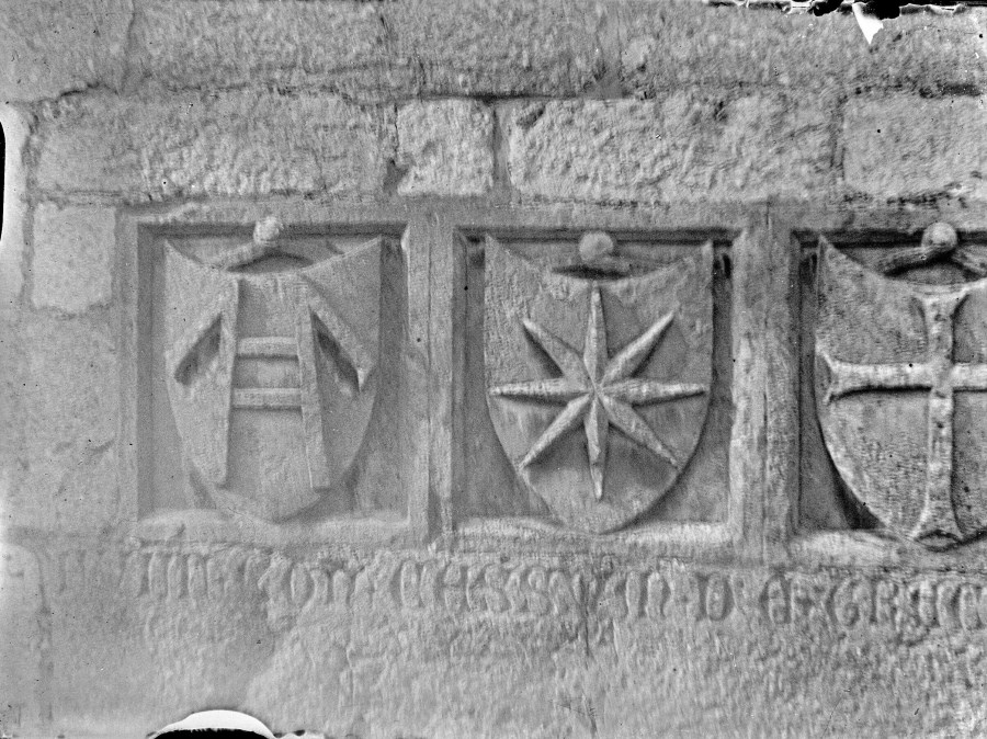 Riproduzione fotografica di alcune stemmi in bassorilievo su pietra e iscrizioni posizionati su una parete esterna di un edificio; l'immagine purtroppo è sfocata.