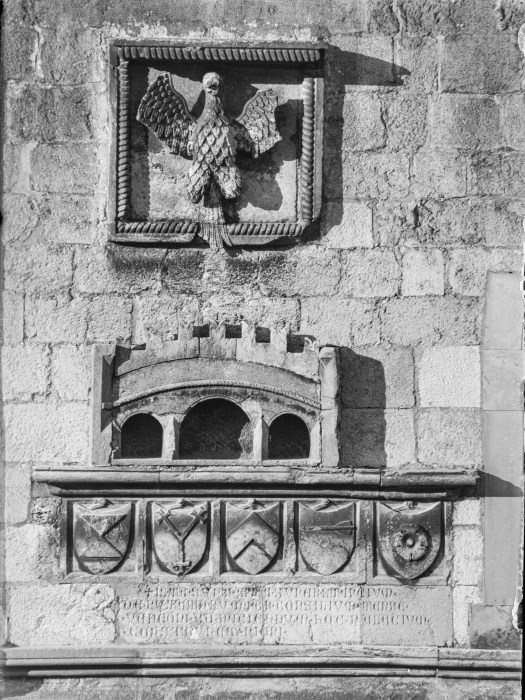 Riproduzione fotografica dei bassorilievi su una parte del Palazzo Comunale di Venzone: l’aquila del Patriarcato Aquileiese ed il ponte merlato stemma della cittadina; alti stemmi in bassorilievo assieme ad un'iscrizione.