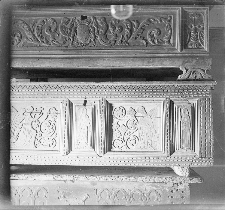 Riproduzione fotografica di bassorilievi su bauli in legno posizionati uno sopra l'altro raffiguranti angeli e santi.