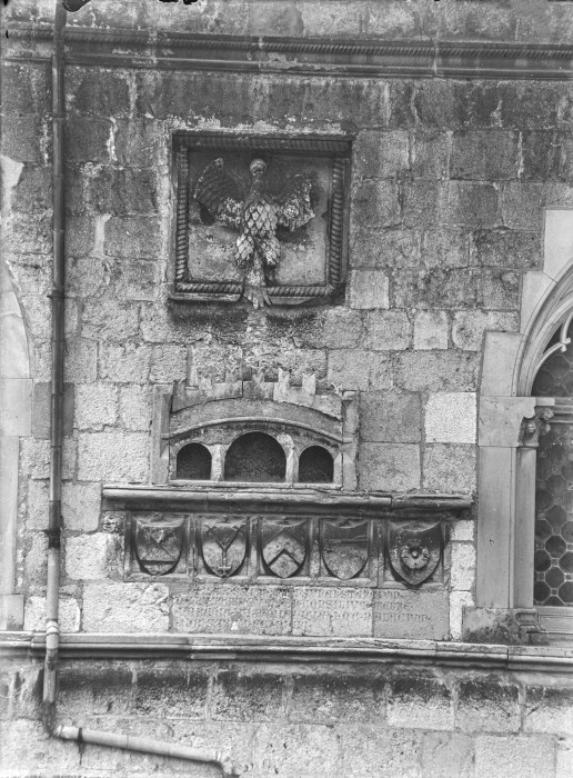 Bassorilievi raffiguranti stemmi, iscrizioni, il castello simbolo di Venzone e un'aquila su una delle pareti esterne del Palazzo Comunale dell'omonima città.