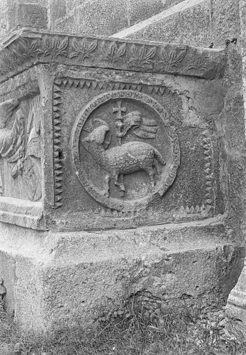 Riproduzione fotografica della porzione laterale di un bassorilievo situato all'esterno di un edificio sacro e raffigurante un un agnello con la croce, simbolo di Cristo.