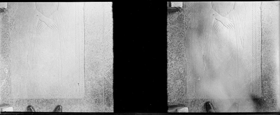 Riproduzione fotografica della parte inferiore di un bassorilievo della figura di un Santo con iscrizioni e stemmi posizionato sul pavimento di una chiesa.