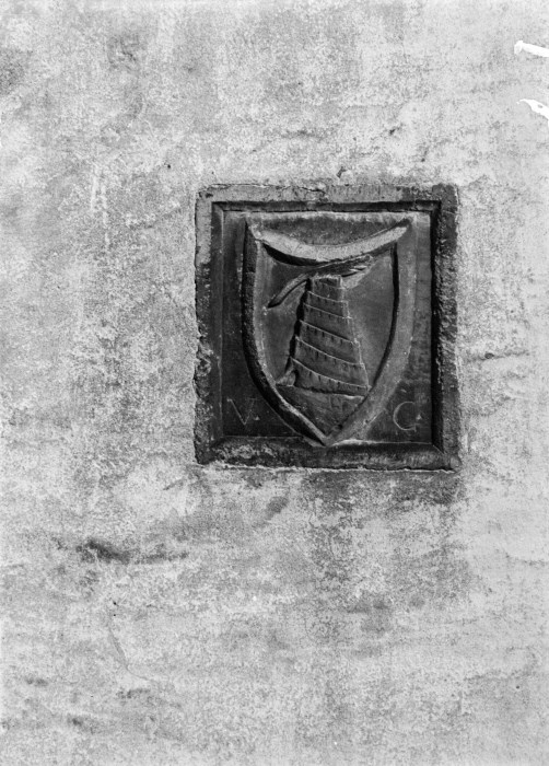Riproduzione fotografica di un bassorilievo raffigurante uno stemma con una torre e posizionato sul muro esterno di un edificio.