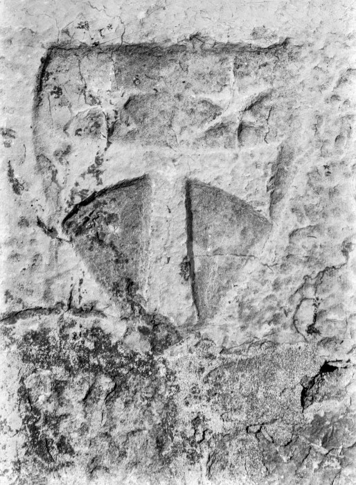 Riproduzione fotografica di un bassorilievo in pietra di uno stemma posizionato probabilmente sul muro interno di un edificio.