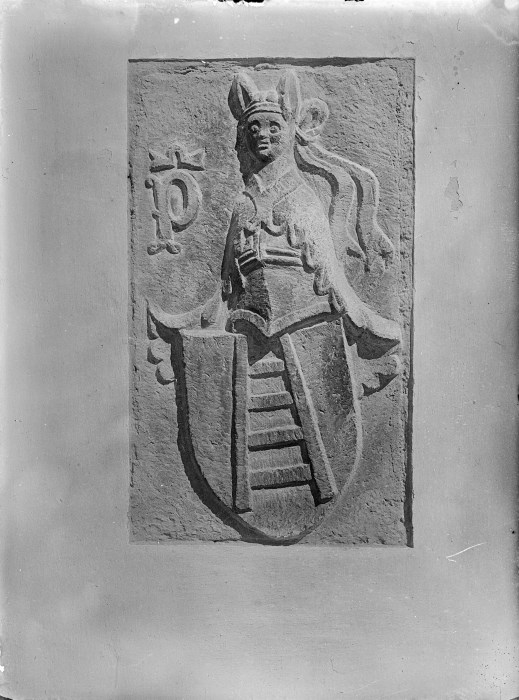 Riproduzione fotografica di un bassorilievo su pietra raffigurante un vescovo con uno stemma.