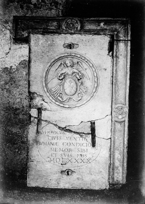 Riproduzione fotografica di un bassorilievo probabilmente risalente al 1580 circa, con iscrizioni, raffigurante un angelo che sorregge uno stemma.