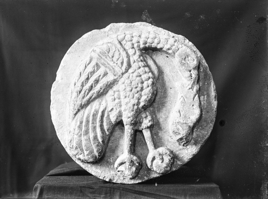 Riproduzione fotografica di un bassorilievo su pietra tondeggiante di un uccello con una preda nel becco.