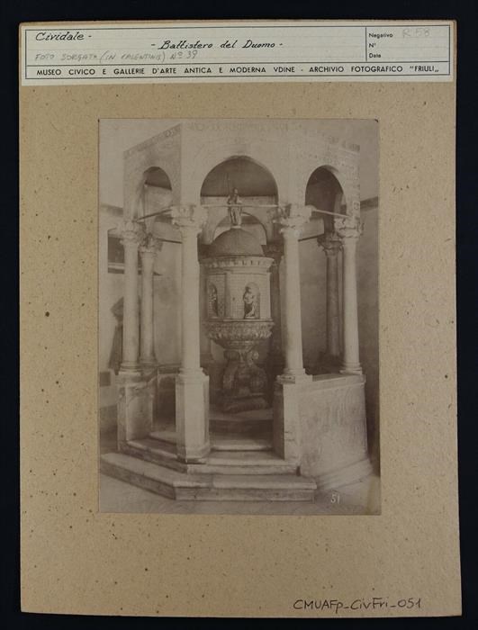 Cividale del Friuli, duomo di Santa Maria Assunta: battistero e fonte battesimale del patriarca Callisto. Capolavoro della Rinascenza di Liutprando (VIII secolo), il battistero in calcare bianco, di forma ottagonale, presenta un tegurio con colonne corinzie e archi a tutto sesto, arricchiti da stilemi geometrici, fitomorfi e zoomorfi (pavoni, grifoni, agnelli e leoni).
