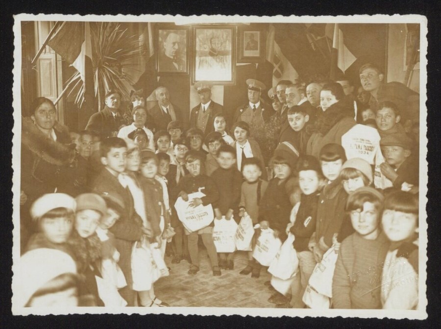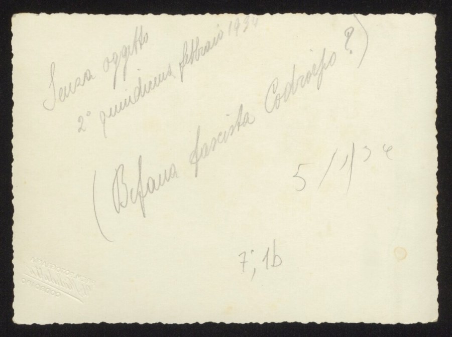Gruppo di bambini e adulti posa in interno: il gruppo si posiziona davanti alle fotografie delle Autorità, tra le quali, a sinistra, si riconosce quella del Duce; i bambini tengono in mano sacchetti bianchi con la scritta "BEFANA FASCISTA 1934". Una nota a matita sul verso, indica come periodo la seconda quindicina del mese di febbraio 1934. La Befana fascista, poi divenuta Befana del Duce o Natale del Duce, è stata una celebrazione benefica in favore dell'infanzia delle classi meno abbienti, istituita dal fascismo per il giorno dell'Epifania.