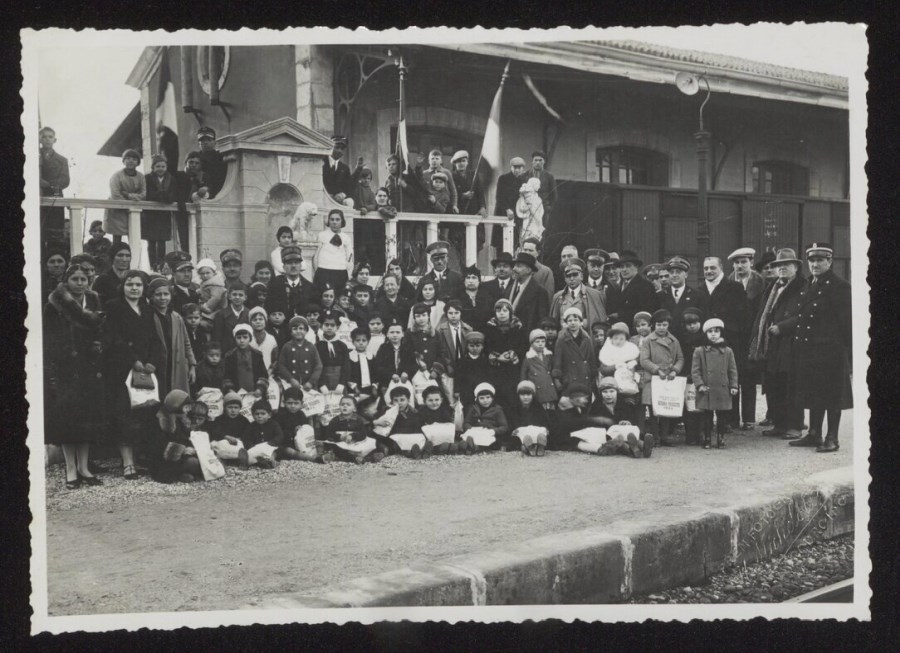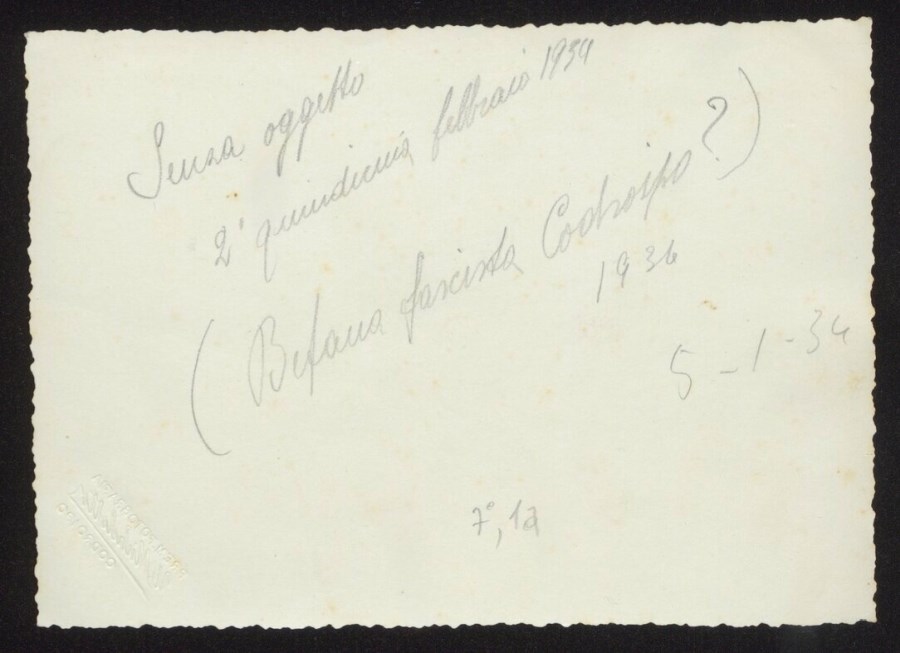 Gruppo di bambini e adulti posa alla stazione di Codroipo: i bambini tengono in mano sacchetti bianchi con la scritta "BEFANA FASCISTA 1934". La Befana fascista, poi divenuta Befana del duce o Natale del duce, è stata una celebrazione benefica in favore dell'infanzia delle classi meno abbienti, istituita dal fascismo per il giorno dell'Epifania.