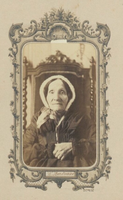 Ritratto in studio della signora C. Bertuzzi con caratteristica cuffia annodata al collo e abito scuro, seduta su una sedia in legno intarsiato.