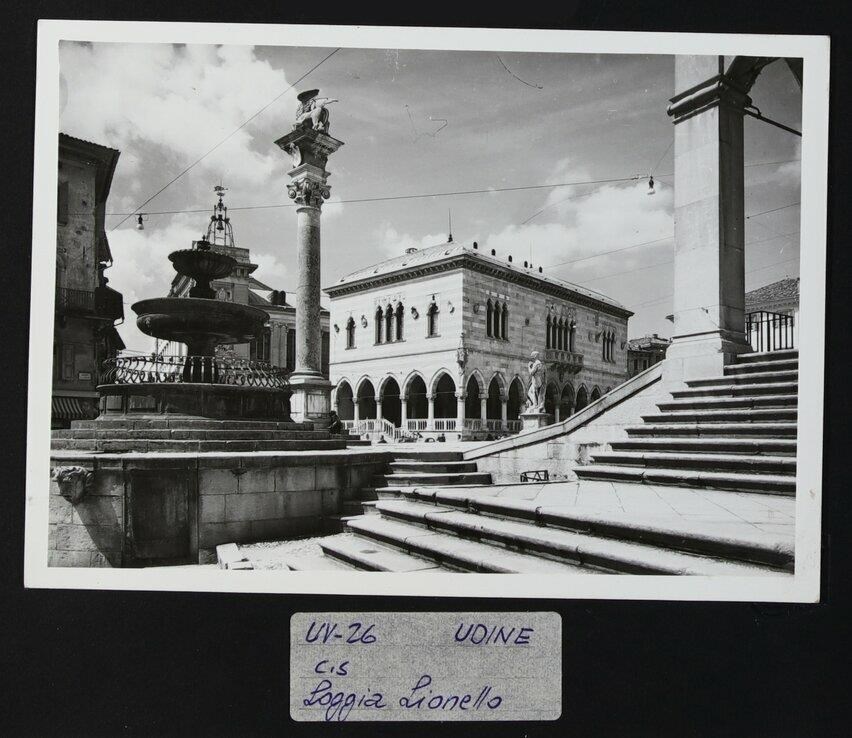 Udine: veduta di piazza Vittorio Emanuele II (piazza Libertà). In primo piano a sinistra, la fontana di Giovanni Carrara (anni Quaranta del Cinquecento). Accanto, subito dietro, la colonna corinizia (1539) con il leone della Repubblica di Venezia, posizionato sulla sopracitata colonna nel 1883. Ancora dietro, uno scorcio del palazzo del Comune o Palazzo D'Aronco (1911-1930) con la campana d'arengo (1419), posta sul lato meridionale, in corrispondenza del caffè Contarena. A destra, la statua di Ercole in pietra d'Aurisina dello scultore Angelo de Putti. Subito dietro, la Loggia del Lionello, finita di costruire per volere di Nicolò Lionello. In primo piano a destra, una parte della Loggia di San Giovanni.