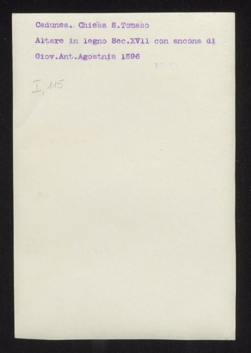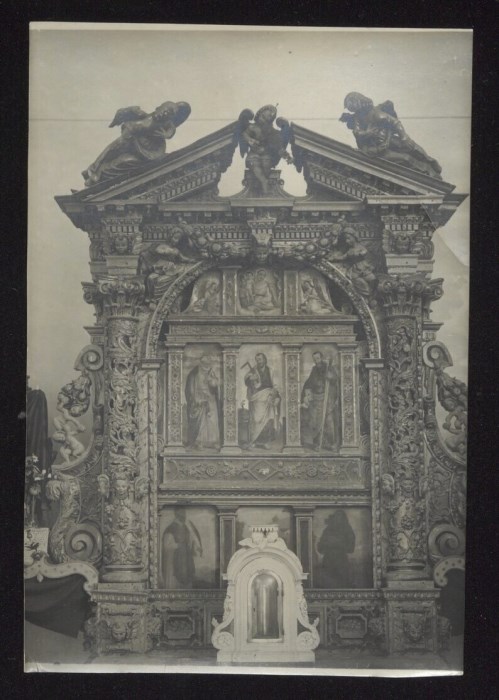 Altare in legno del secolo XVII, attribuito a Gerolamo Comuzzo e alla sua bottega, con - secondo la didascalia sul verso dell'immagine - ancona di Giovanni Antonio Agostinis, datata 1596, nella Chiesa di San Tommaso Apostolo a Cadunea, località di Imponzo, frazione di Tolmezzo.