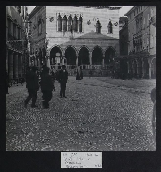 Udine: veduta di uno scorcio di piazza Vittorio Emanuele II (piazza Libertà) e di via Mercatovecchio con, a sinistra, il caffè Dorta, che trae le sue origini nel 1864 grazie a Pietro Dorta (nel 1879 "Caffè e Premiata Pasticceria e Confetteria Pietro Dorta & C.") e che venne chiuso nel 1958, presso Palazzo Tealdi-Campiutti-Dorta (di origine quattrocentesca). In secondo piano al centro, la Loggia del Lionello, finita di costruire per volere di Nicolò Lionello. A destra, Palazzo Sacchia (dei primi anni del Cinquecento), con portico costituito da quattro archi, e Palazzo Zorzi, edificato su progetto di Cesare Miani (1923) e sviluppato su tre piani .