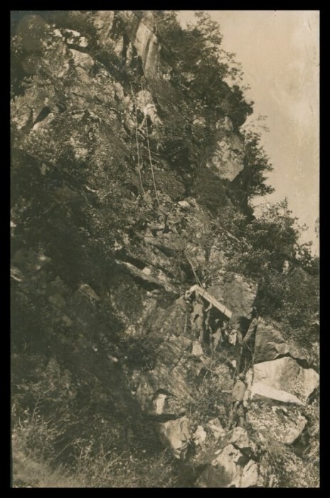 Militari calano bare con salme di caduti della Prima Guerra mondiale, con l'aiuto di funi, lungo una parete rocciosa