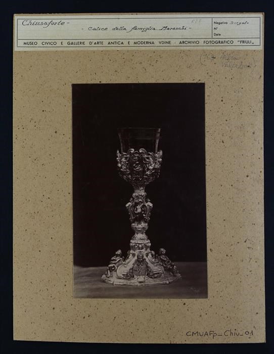 Chiusaforte: calice d'argento dorato con decoro arabescato (XVIII secolo) proveniente dalla casa della famiglia Mareschi. Sono presenti, sul piede, dei piccoli putti.