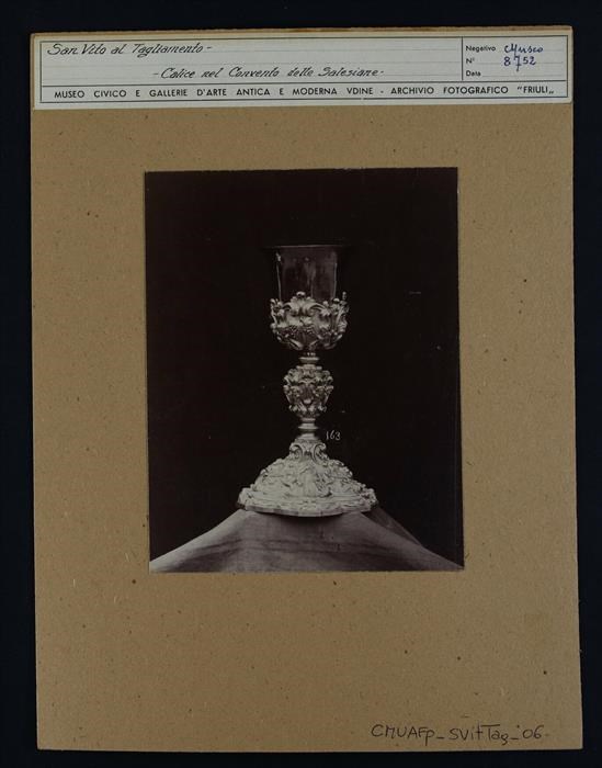 San Vito al Tagliamento, monastero della Visitazione: calice settecentesco realizzato con la tecnica della cesellatura e costituito da una coppa in argento dorato.