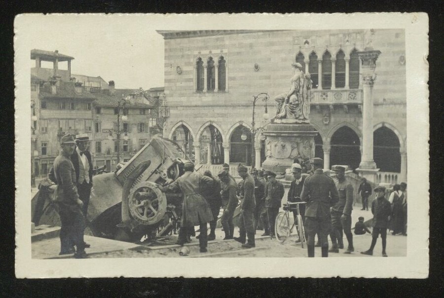 Una folla di soldati e di passanti in Piazza Libertà già Piazza Vittorio Emanuele a Udine mentre osservano un camion precipitato dalla salita che conduce al castello.