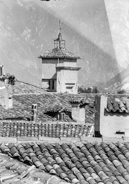 Veduta, fra i tetti delle case di Venzone, della campana posizionata sulla torre del Palazzo Comunale.