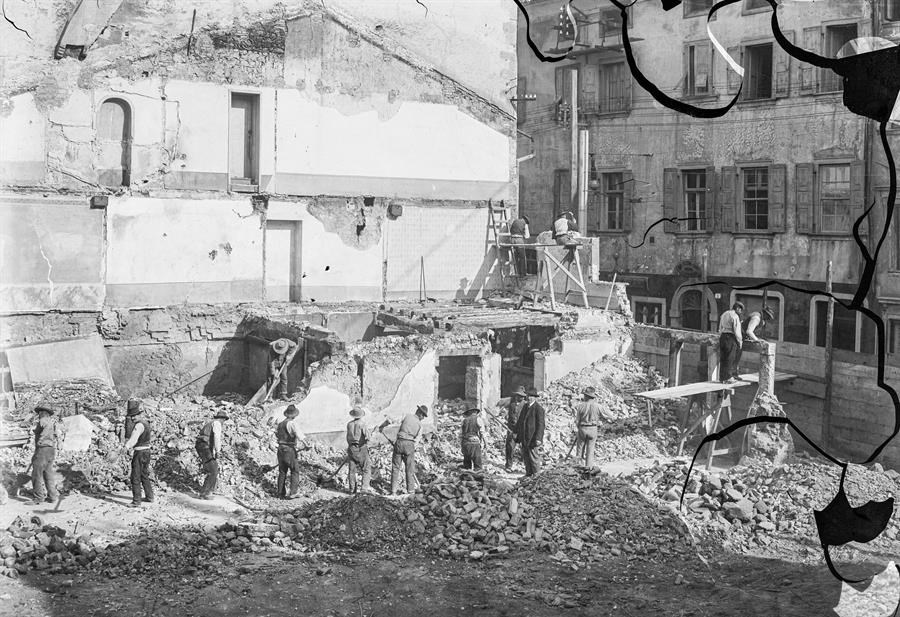 Cantiere di demolizione del quartiere tra le vie Cavour, Rialto e Lionello per la costruzione di Palazzo D'Aronco