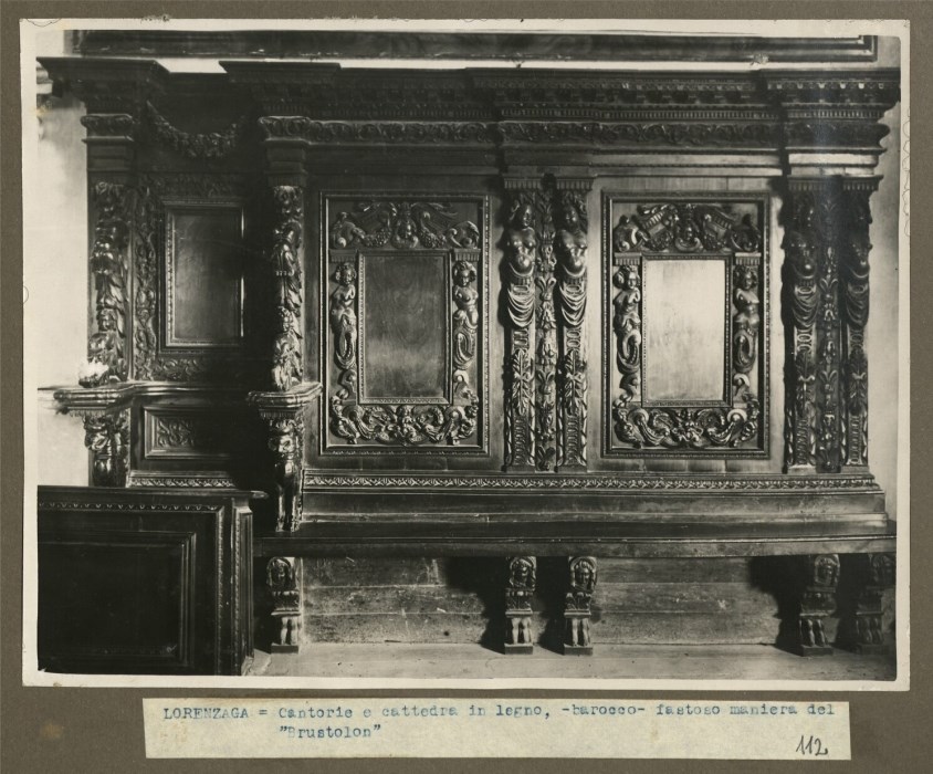 Riproduzione fotografica di una cantoria ed un cattedra in legno intarsiato conservate presso la Chiesa di San Silvestro a Lorenzaga a Motta di Livenza.