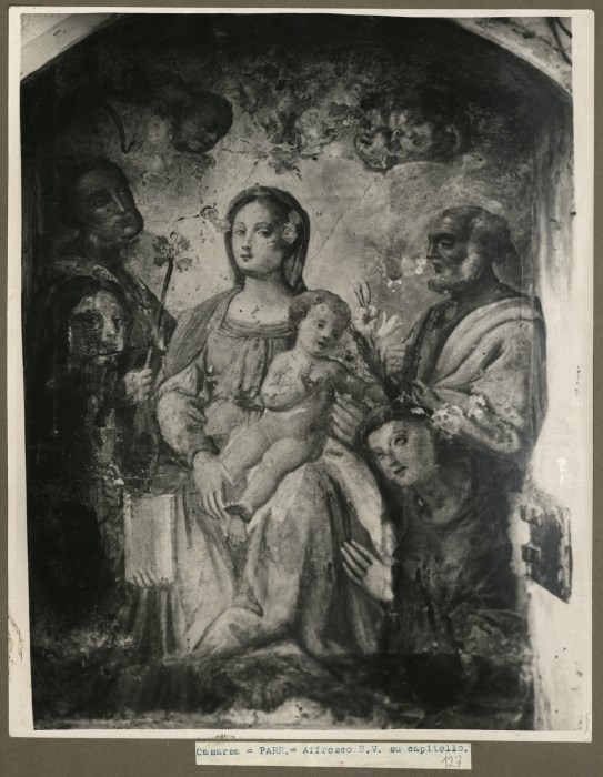Riproduzione fotografica di un affresco della "Madonna con Bambino fra i Santi" in un capitello all'interno della Chiesa di Santa Croce e della Beata Vergine del Rosario a Casarsa della Delizia.