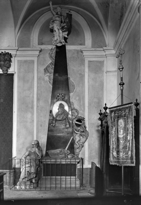 Veduta dell'interno della cappella del Castello Colloredo Mels di Monte Albano: un obelisco con sculture e stemmi.