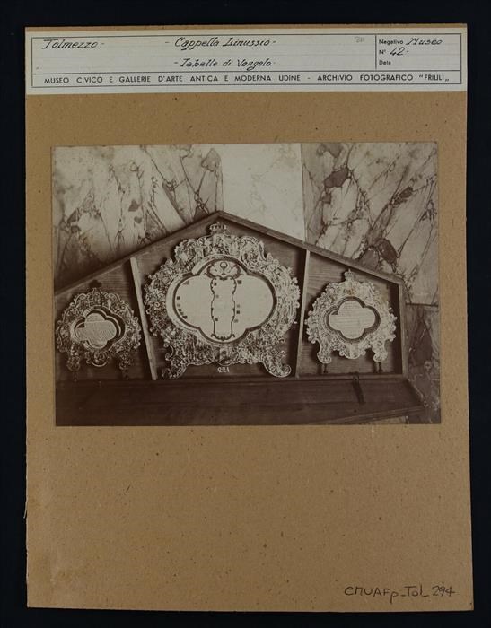 Tolmezzo, cappella di Palazzo Linussio: tre tabelle lignee del Vangelo (cartagloria) con mosaici e tarsie in madreperla (XVII-XVIII secolo).