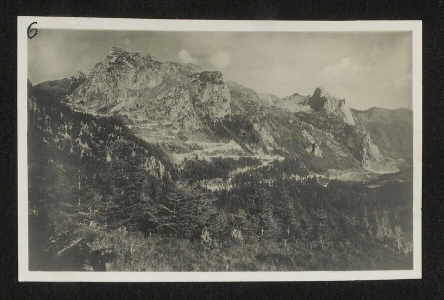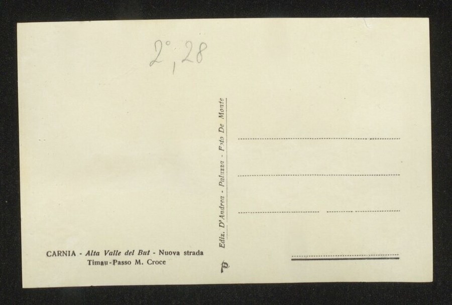 Veduta panoramica dell'Alta Valle del But, con ben visibile la strada che collegava Timau al Passo di Monte Croce. Il progetto di questa nuova strada fu approvato nel 1929 e la strada inaugurata il 30 giugno 1933.