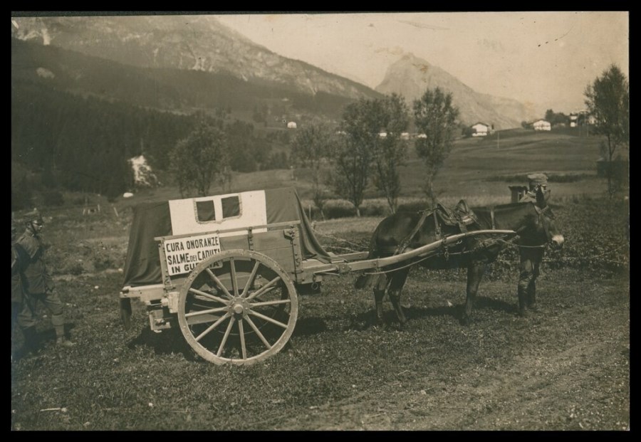 Carro trainato da mulo, con caricata una bara coperta dalla bandiera italiana con salme di caduti nella prima Guerra mondiale, in zona montana. Il mulo è condotto da un militare in divisa; altri due soldati si vedono in piedi, al seguito del carro.