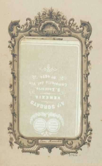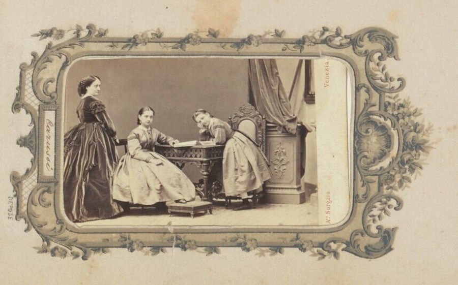 Ritratto a figura intera in studio della signora Carussi con figlie, sedute ad un tavolo, con ampi vestiti ed eleganti acconciature.
