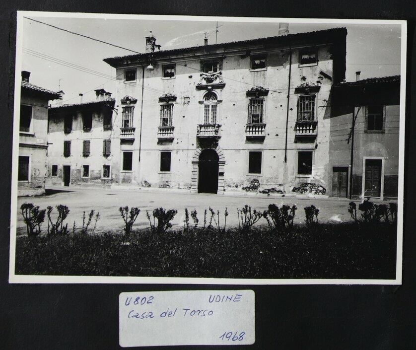 Udine, Largo dei Cappuccini: facciata di Palazzo Cassini-Camucio-del Torso (fine del Seicento). Dal 1925 all'inizio della seconda guerra mondiale il proprietario fu Luciano Del Torso. L'edificio non presenta ancora l'intonacatura che verrà realizzata nel secondo Novecento. Caratterizzano la facciata il portale bugnato, le quattro finestre con balaustra e architrave e la porta finestra con mascherone.