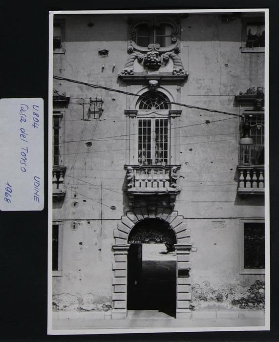 Udine, Largo dei Cappuccini: particolare con l'ingresso e la porta finestra contraddistinta da un mascherone della facciata di Palazzo Cassini-Camucio-del Torso (fine del Seicento). Dal 1925 all'inizio della seconda guerra mondiale il proprietario fu Luciano Del Torso. L'edificio non presenta ancora l'intonacatura che verrà realizzata nel secondo Novecento. Caratterizzano la facciata il portale bugnato, le quattro finestre con balaustra e architrave e la porta finestra con mascherone.